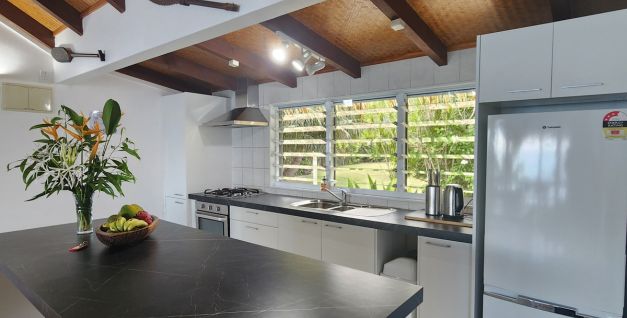 The living area extends out onto a roomy beachfront deck that runs the full width of the villa. There is a BBQ, outdoor dining furniture and sun loungers. Uninhibited lagoon views all the way! Some of the very best in Rarotonga.