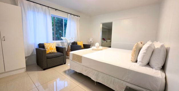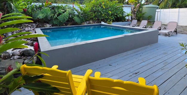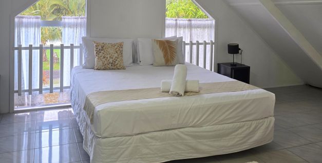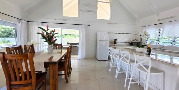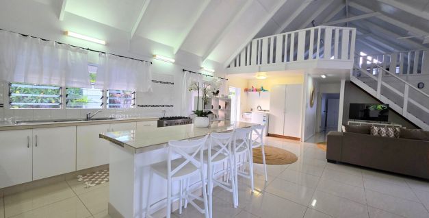 Literally minutes from the best swimming and snorkeling beaches in Rarotonga, this 3-bedroom, 2-bathroom house is stylish & comfortable. Great value, Kayne’s House is set in tranquil surroundings. The bedrooms have king-size beds which can be split into singles. One bedroom is located upstairs, open plan in a mezzanine type arrangement. Two bedrooms and the bathroom are located downstairs. One of the bedrooms downstairs has an ensuite bathroom.