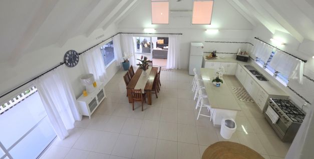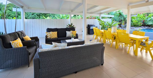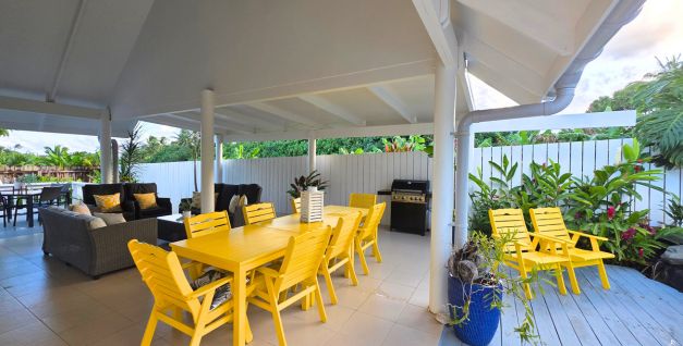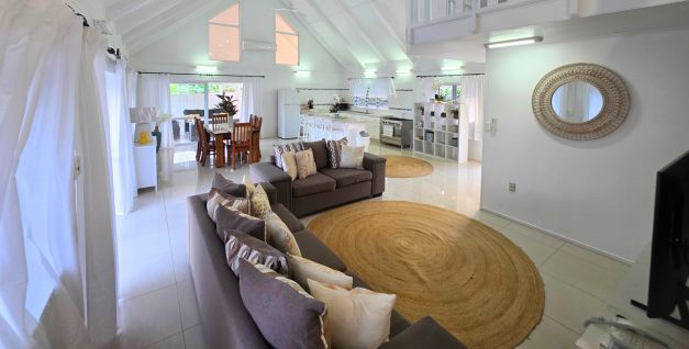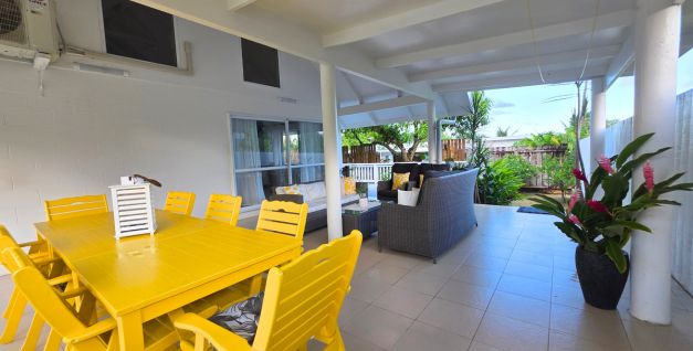 There are plenty of comfortable sofas to relax on in the spacious living areas. Indoors, the dining table seats eight and the fully equipped kitchen includes stove, fridge/freezer and microwave.. Windows are screened and pedestal fans add to your comfort. The flat screen TV is good for those nights in or for entertaining the family! There is a small sound system for those who prefer listening to music. A deck, BBQ, loungers and outdoor dining furniture give a relaxed outdoor living space, while the grassed area is great for sporting activities.