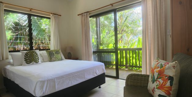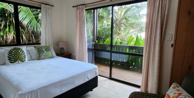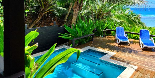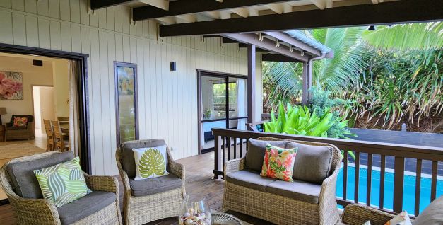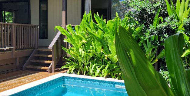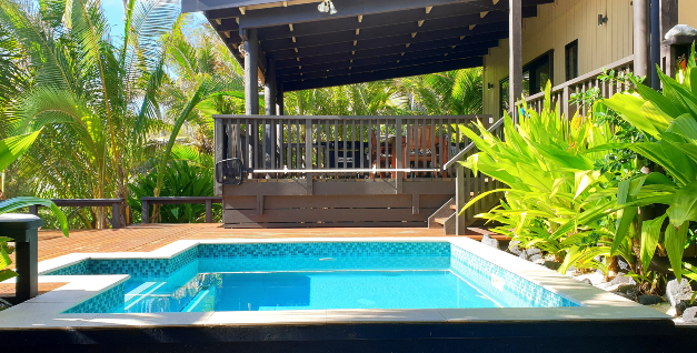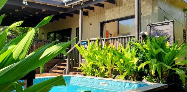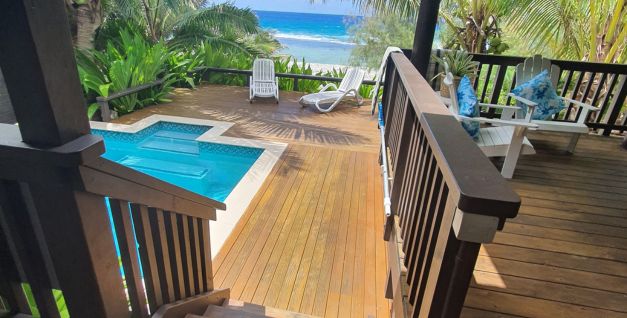 The lagoon is a little rocky in this area, but definitely swimmable and great for a dip to cool down (reef shoes recommended) – or you can swim in your private pool, which is positioned beachside, for a super-relaxing lounging area sheltered from the sun with a sail. You have a private, sheltered sandy beach space to enjoy directly in front of the large deck – or you can explore the ocean beach and watch the waves crash on the reef!