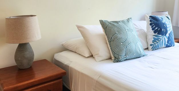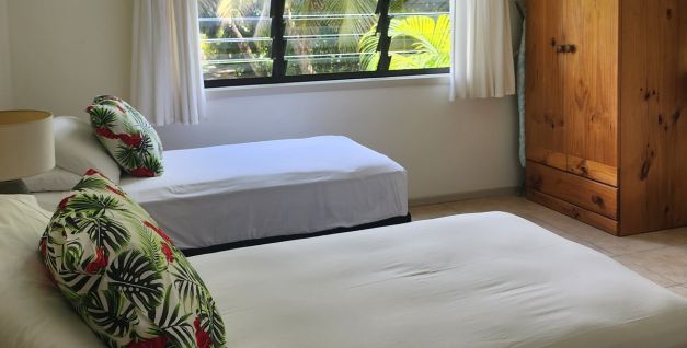 - Bedrooms x 3 – 2 x queen size beds, one bedroom has 3 single beds, portacot available on request, extra linen and duvets, reading lamps, ceiling fans